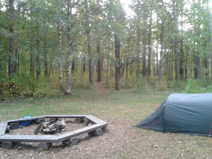 Klockan var mycket när vi till slut återvände till Carlslund och kunde slå upp vårt tält i närheten av klättertallen. Det var en fin plats att campa på med både grillplats och en fin utebänk. 🙂