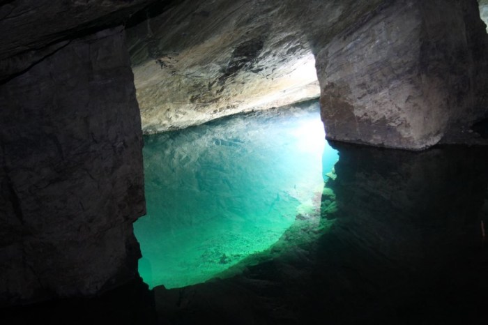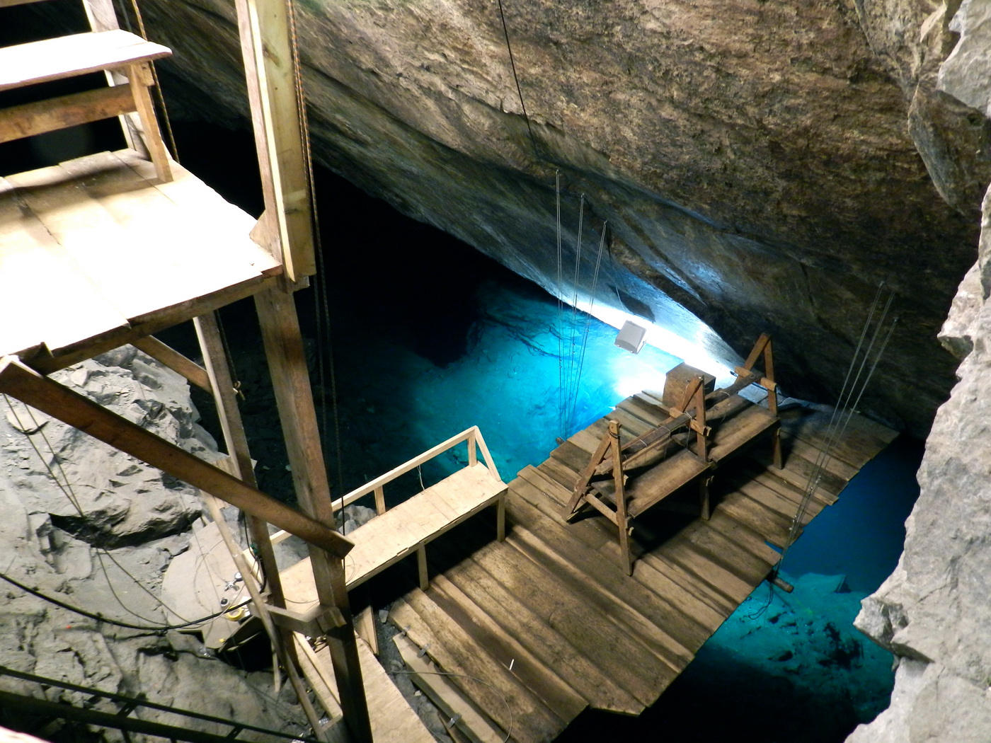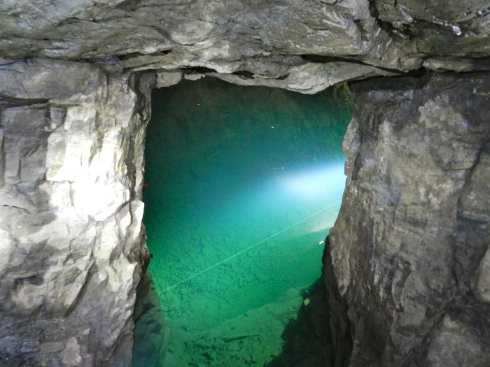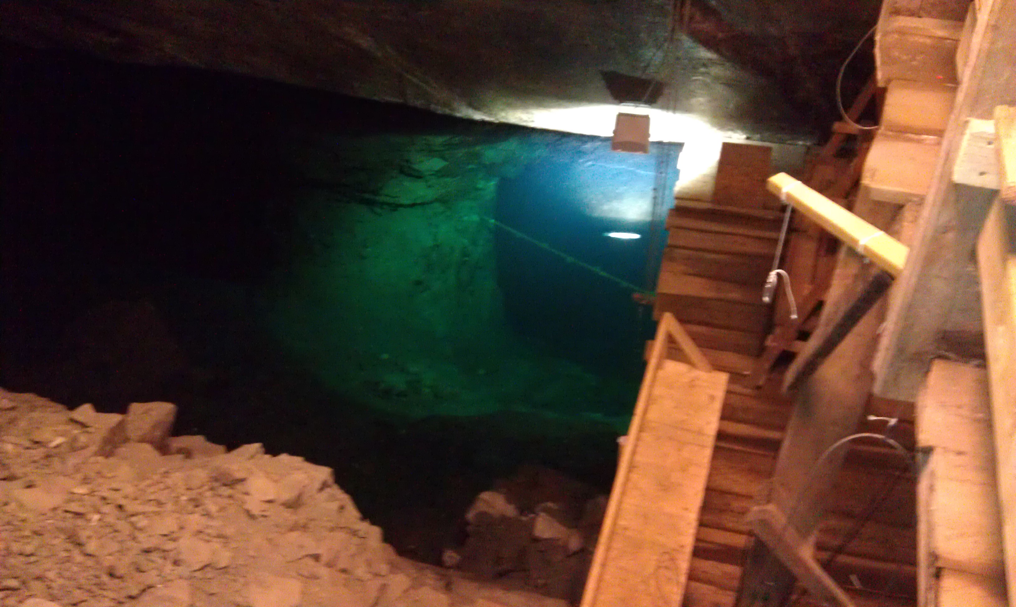 När vi kommit ungefär 80 meter ner kom vi till grundvatten-nivån och det var ett fantastiskt klart och grönblått vatten härnere. Tuna-Hästberg är välkänt i dykarkretsar och hit kommer folk från alla jordens hörn för att dyka i denna unika och speciella miljö.