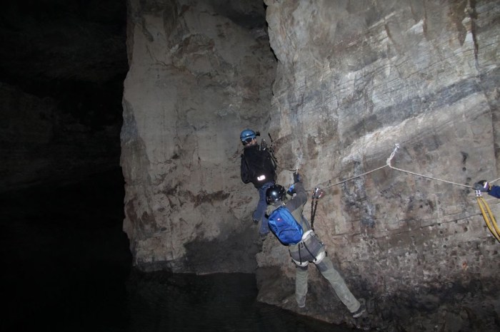 Vi fortsatte vår tur och fick äntligen veta vad hjulen vi lånat skulle användas till: från ett hål i bergväggen skulle vi ta oss över en vattenfylld ravin till ett annat hål i berget på andra sidan.