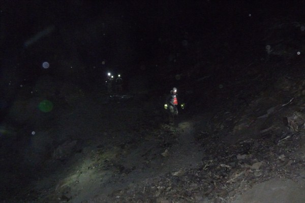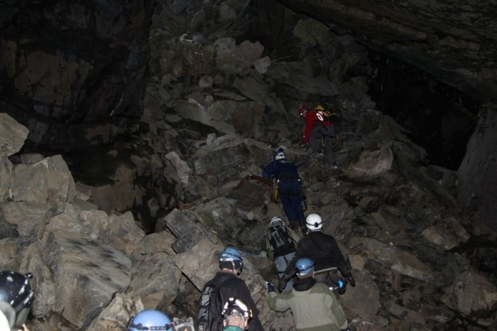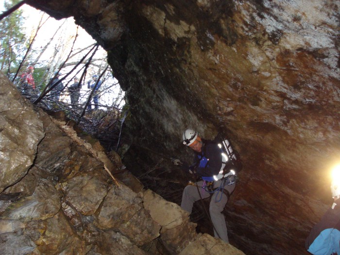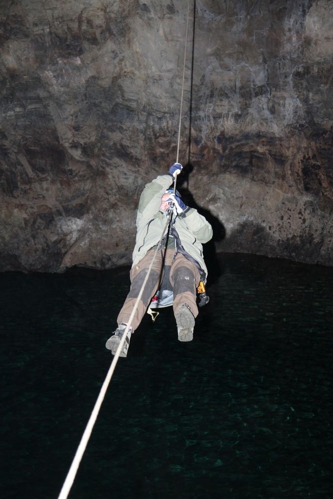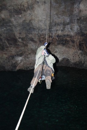 Vi fick återigen släcka alla våra pannlampor och då såg vi, som en pytteliten ljuspunkt, en svag glimt av dagsljuset långt däruppe.