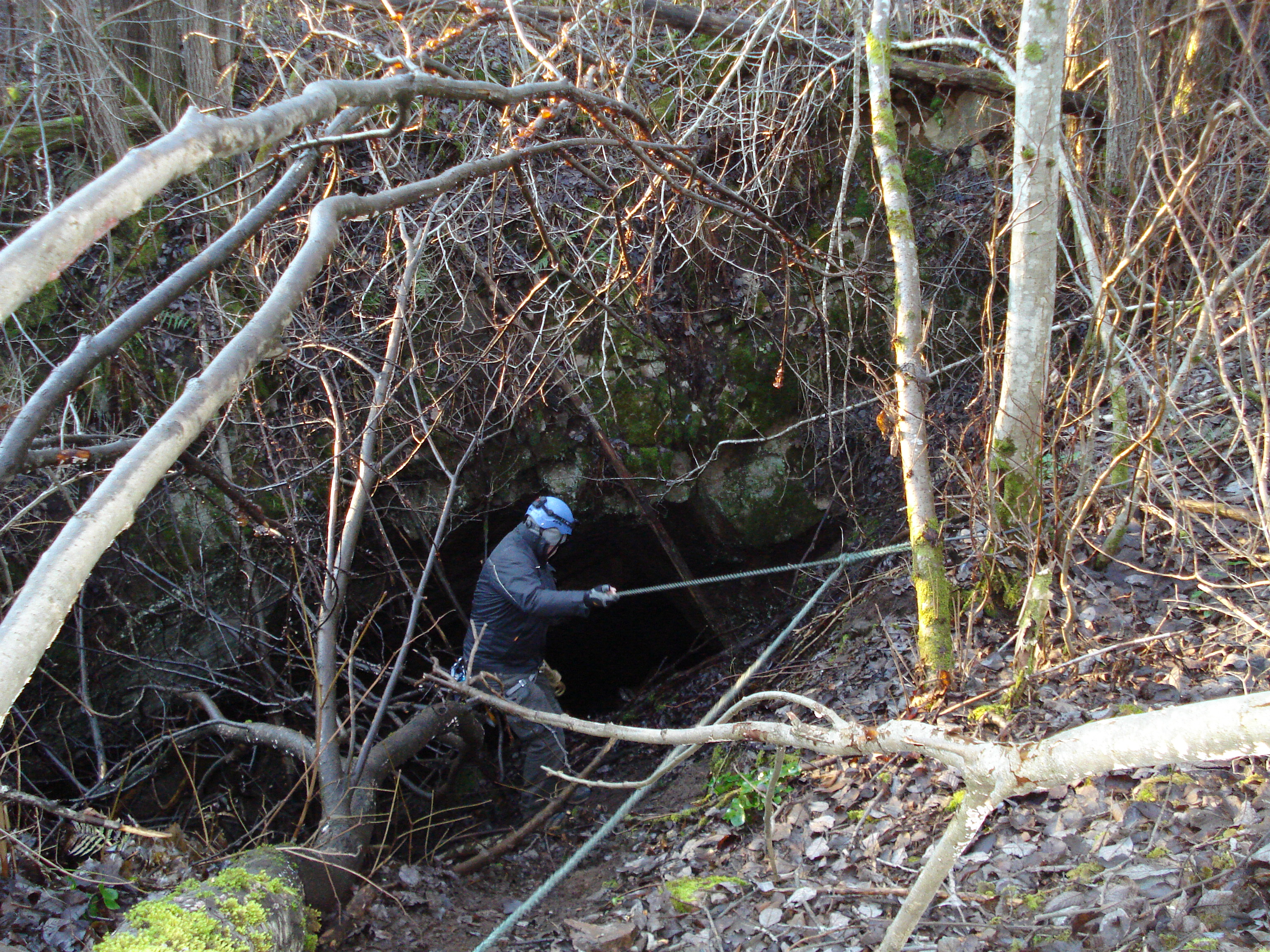 Så var det dags att ge sig ner i gruvan. Vi kom till en snårskog där det fanns ett rep som försvann snett ner i ett hål. Det var här som guiden Nicklas och hans kompis i starten för över tio år sedan hade börjat gå ner och utforska gruvan. Det här hålet i skogen hade ropat ”Kom! Kom!”