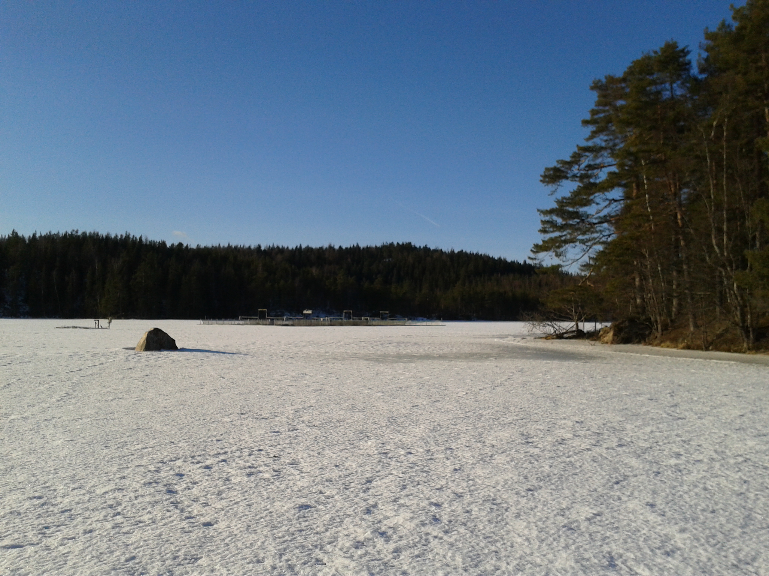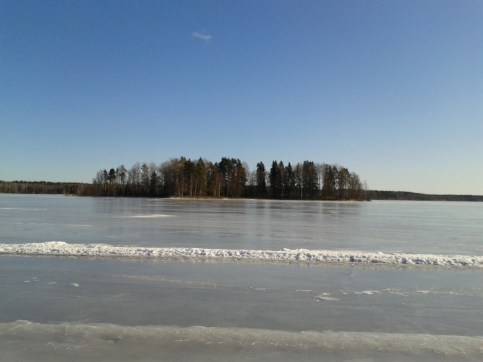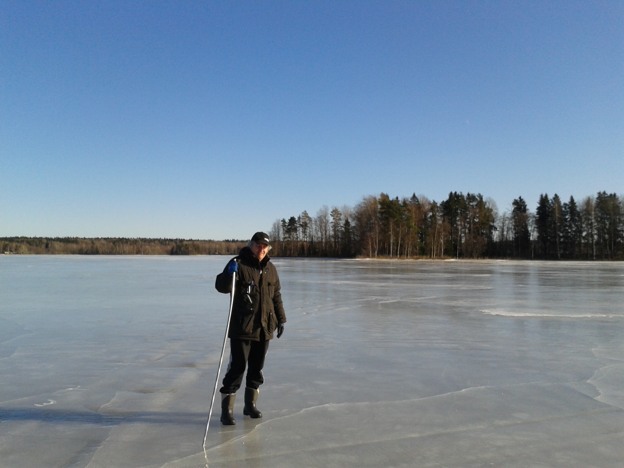 Den här dagen låg isen blank och fin som en spegel som frusit på efter de senaste dagarnas töväder. Man skulle ha haft skridskor, men vi hasade oss sakta över i solskenet och Hasse hade en lång järnpinne som ispik.