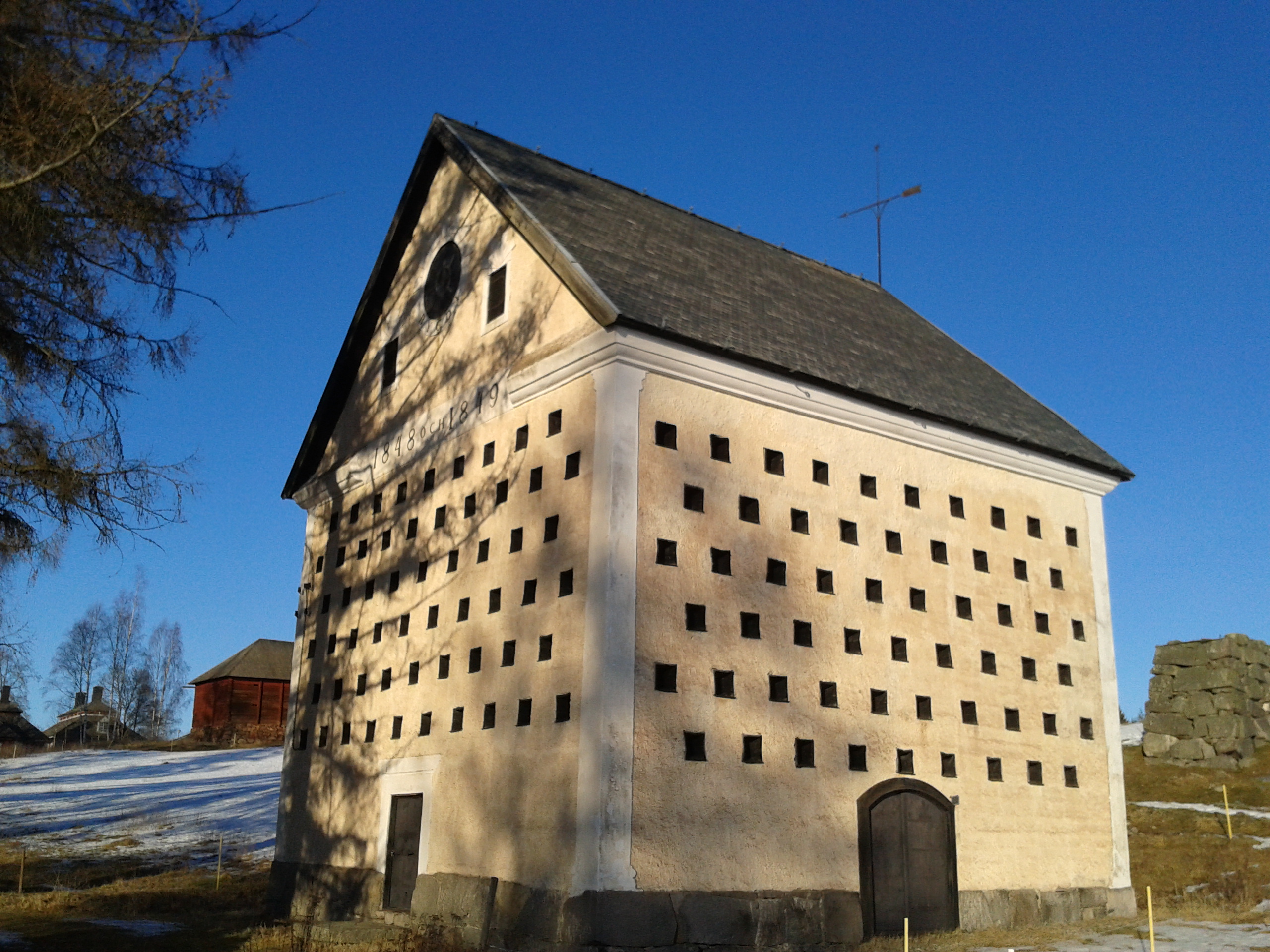 Vi gjorde ett stopp till på vägen hem och det var i Malingsbo. Där såg vi den här fina byggnaden. I det här huset finns en anordning som man torkade säden i förr i tiden. Det som ser ut som fönster är luftintag och inuti finns timrade fickor dit säden genom en sinnrik mekanism fick falla ner i en lång bana. Måste ha varit väldigt modern teknik i mitten på 1800-talet då den sattes upp. Vacker var den i alla fall mot den klarblå himlen. Anordningen kallades för Kornskruven och det skulle vara riktigt spännande att se hur det ser ut inuti huset.