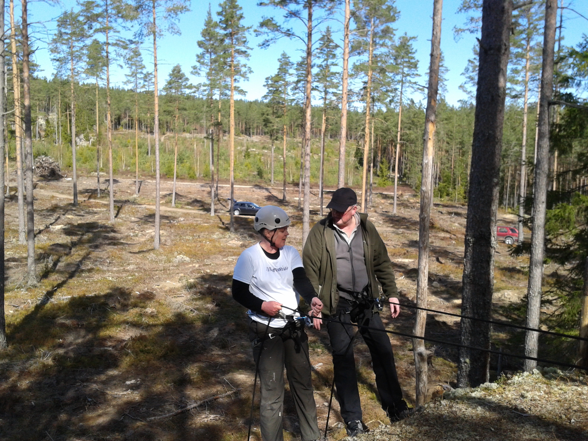 På söndagen åkte vi till Riddarhytteskogen och tränade firning med ett helt gäng cachare från Fagersta och Skinnskatteberg. Det blev en härlig dag i vårsolen med trevligt sällskap, modiga firare, glada tillrop och utbyte av erfarenheter. Här är syskonen Ricke59 och Mirimis på väg ner. Mirimis för allra första gången.