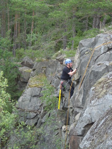 På morgonen vaknade vi och upptäckte att det fanns en Äventyrscache bara 250 meter från vårt nattläger. Vilken lycka. 😉 Vi gick upp på klippan och firade oss ner och fick fin utsikt över Klämmingsbergsbadet.