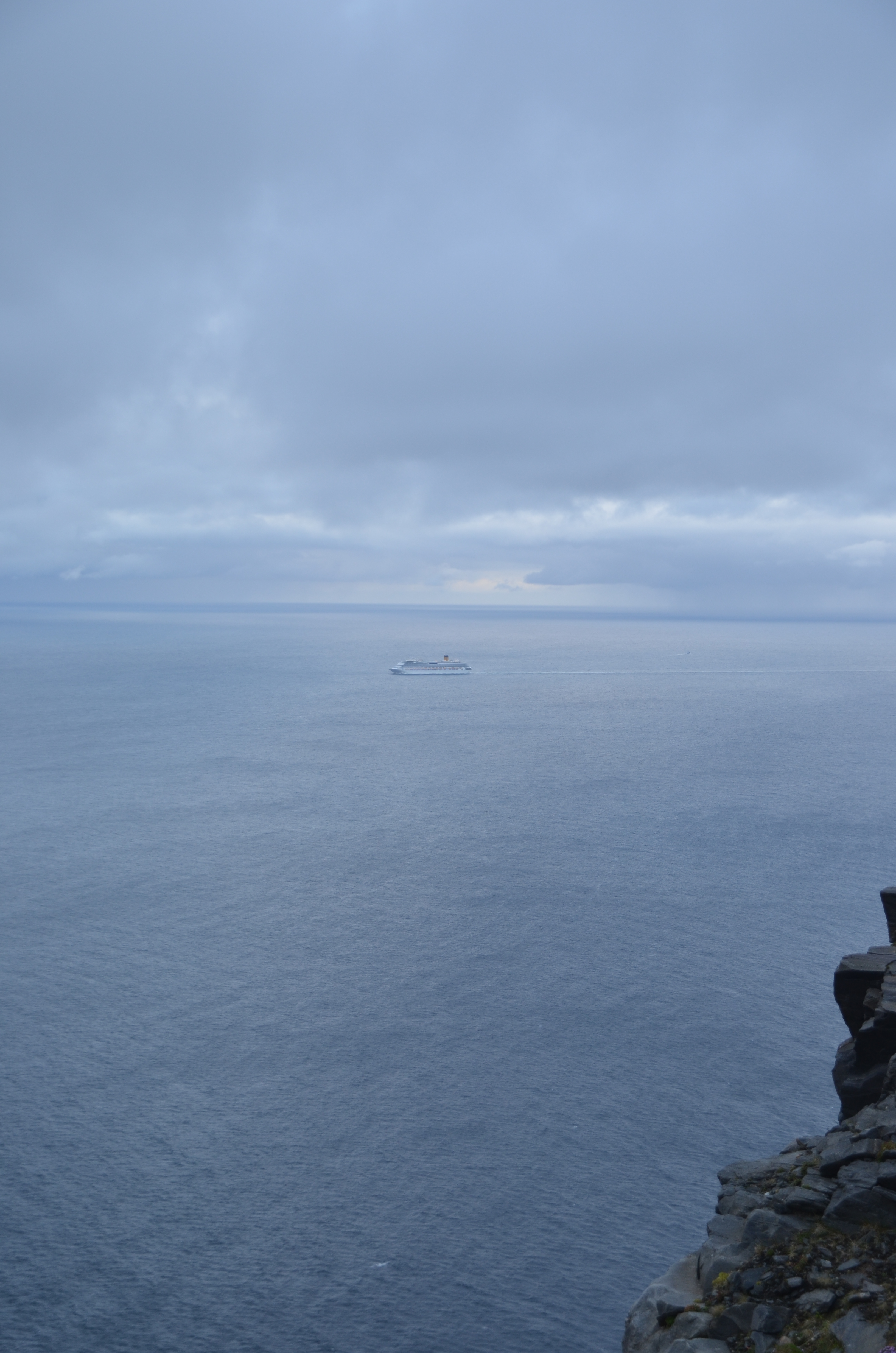 I Honningsvåg stannar Hurtigruten. Här får turisterna åka sista biten med buss upp till Nordspetsen. Här en bild på Hurtigruten som vi lyckades fånga kvällen innan, vid Nordkap. Titta noga. 🙂
