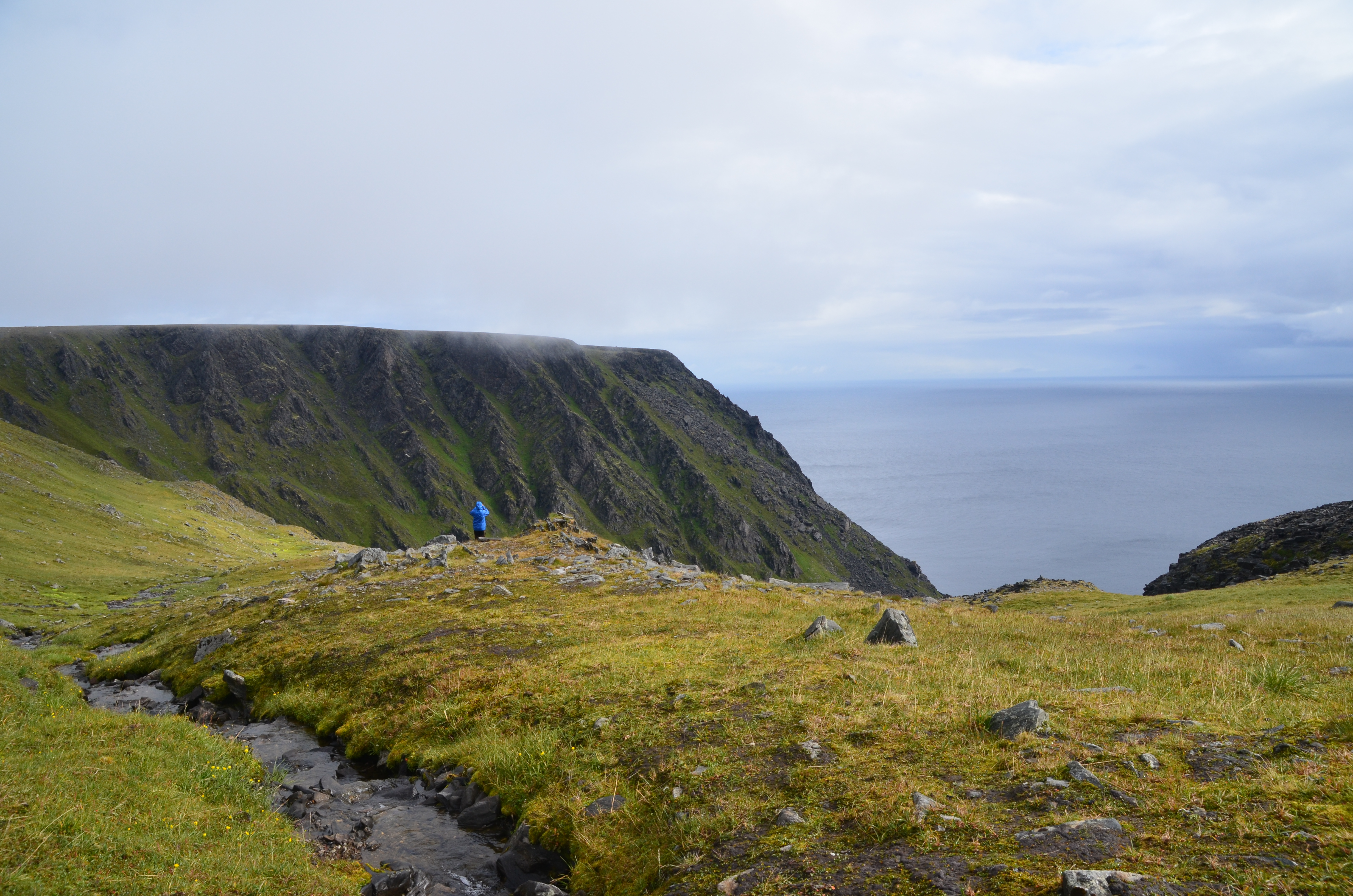 Det var härifrån vi skulle ha börjat vandringen mot Knivskjellodden som är den egentliga nordligaste spetsen på Nordkap, men vi fick tyvärr lägga ner den planen då det blåste och regnade för mycket. 😦 Men här är en bild av Knivskjellodden som vi hann ta då det var finare väder.