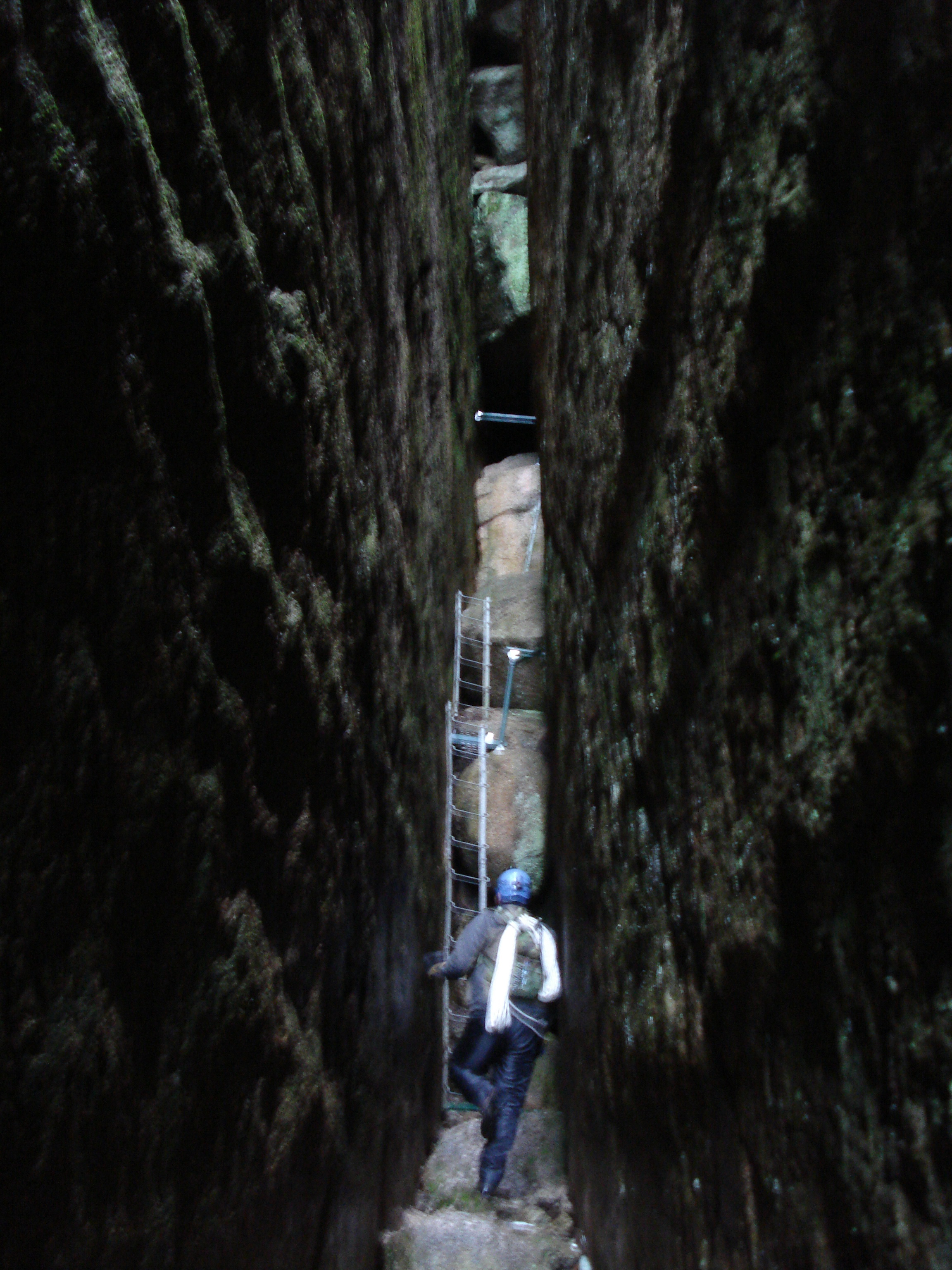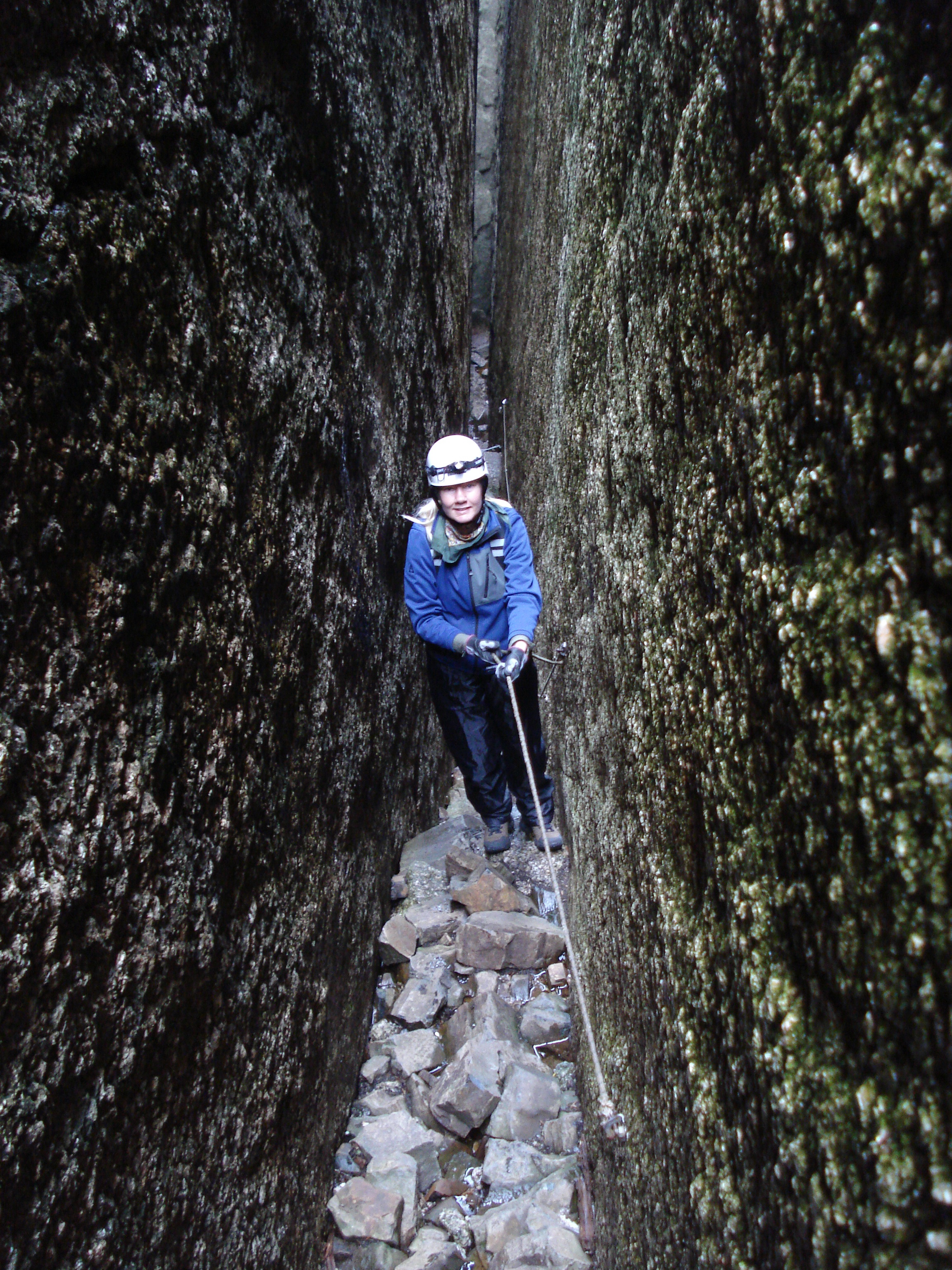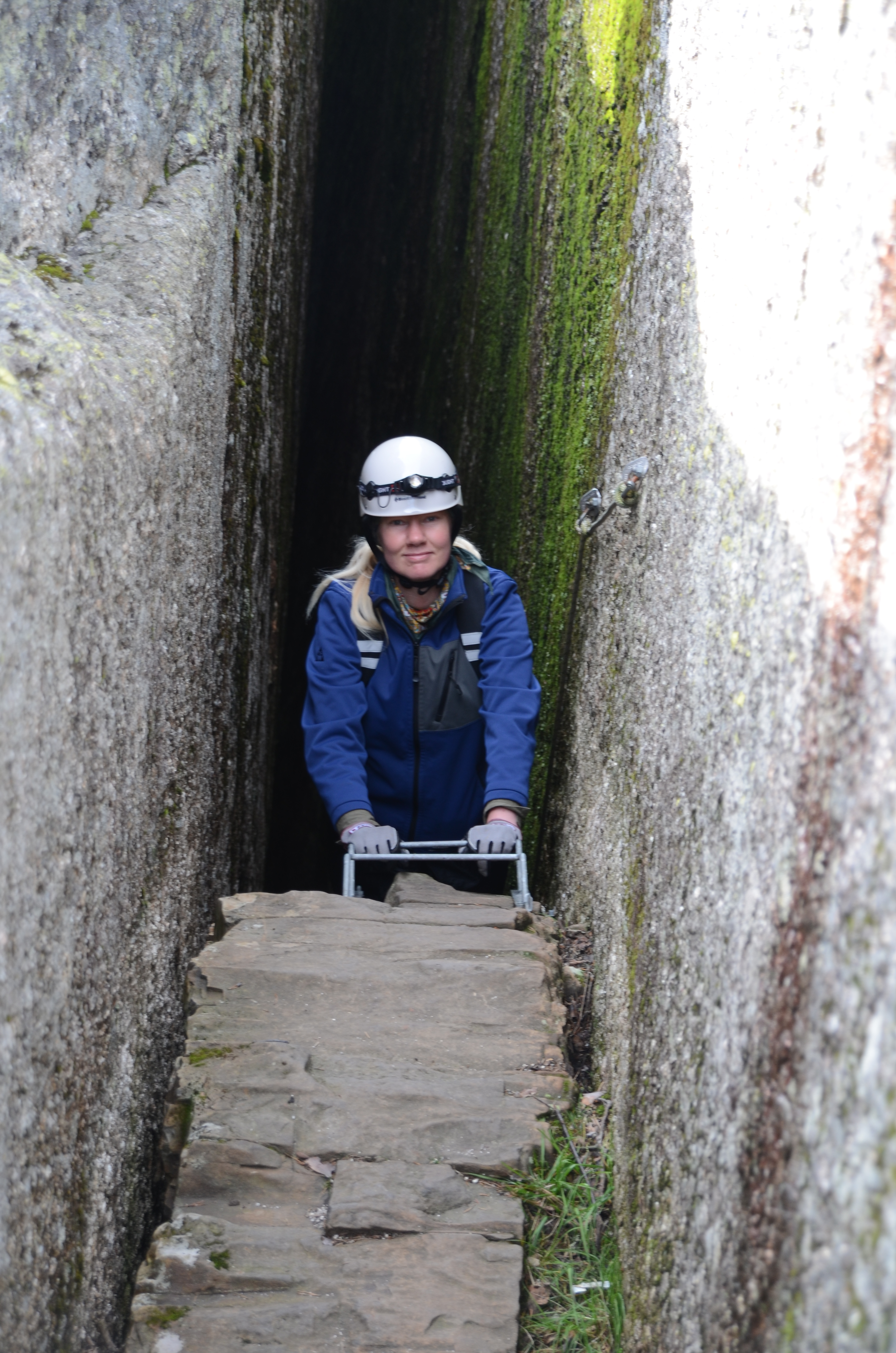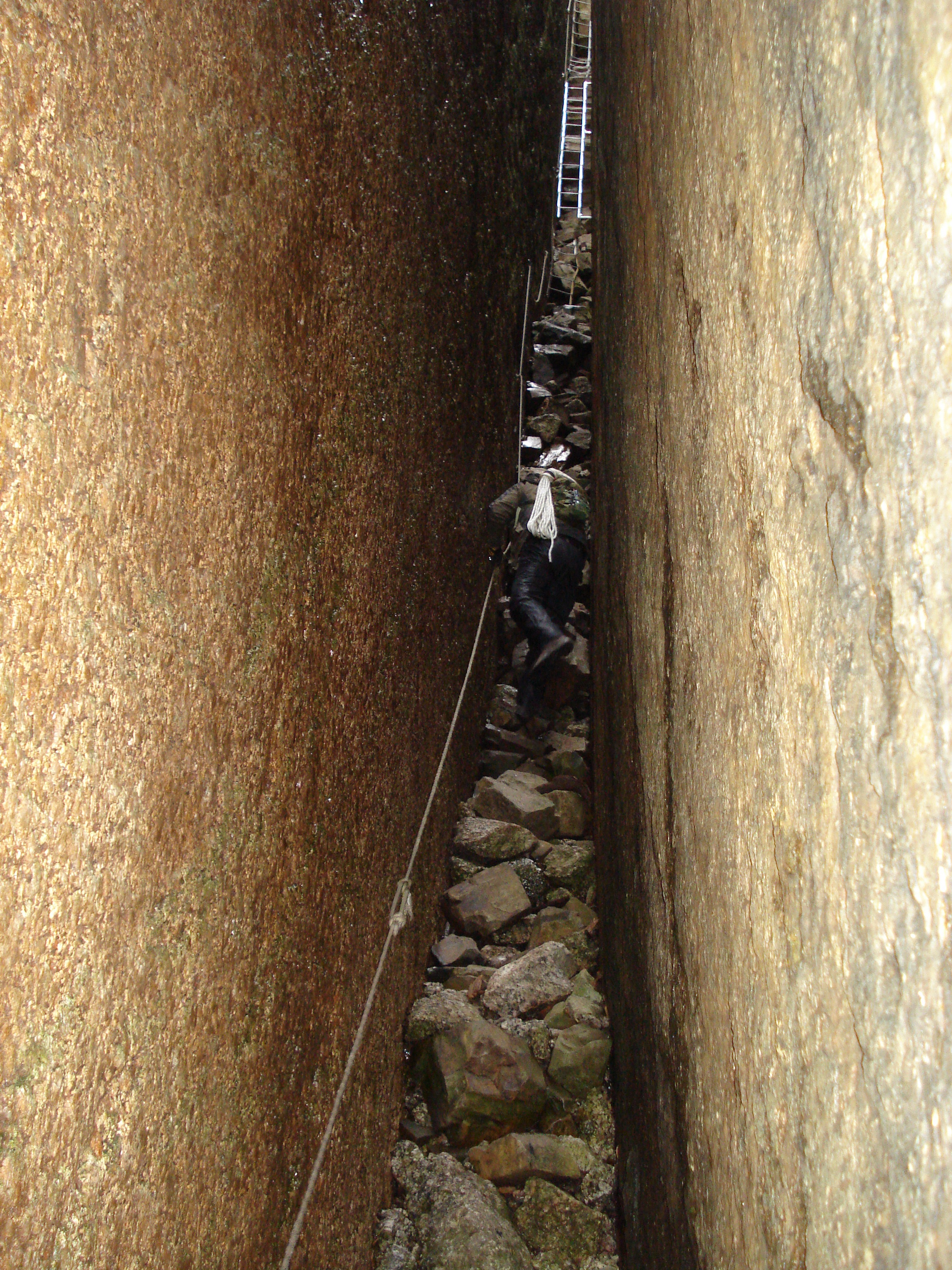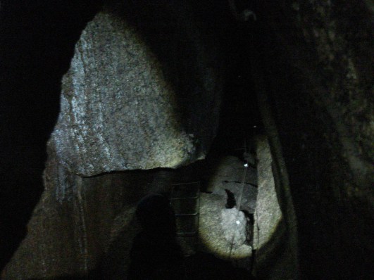 Det finns en led genom grottsystemet med hållrep, stegar och plattformar där det behövs. Här går vi baklänges längre och längre ner i den trånga skrevan.