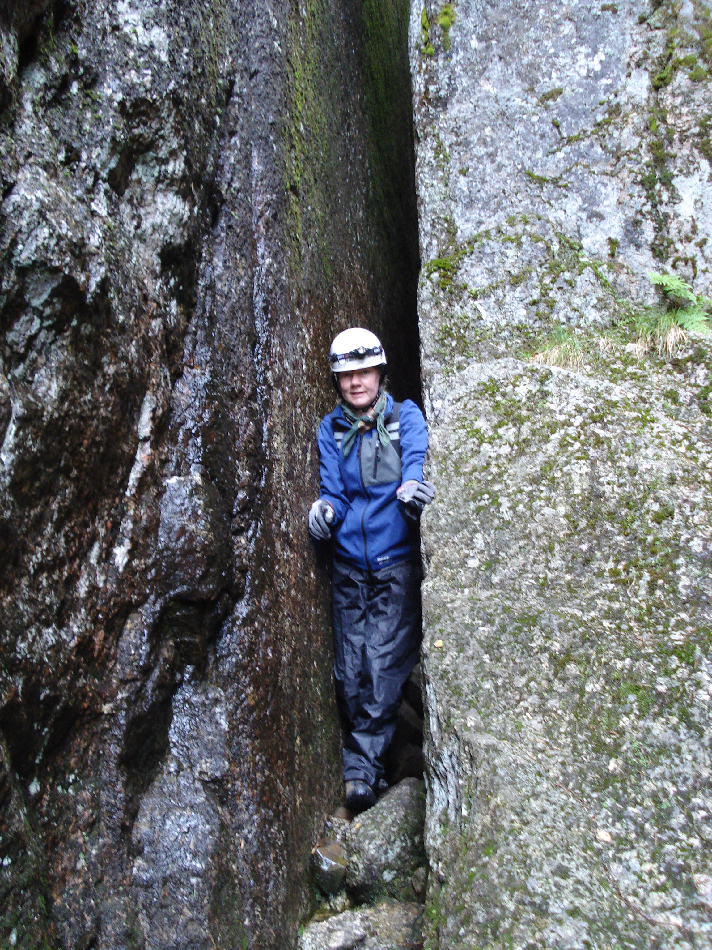 Skrevan blev allt smalare ju längre ner/in man kom. Mot slutet kunde man inte ens vända sig om. Man får inte vara för storvuxen om man ska kunna klämma sig igenom här. Lite läskigt var det också när vi såg stora stenar som satt fastkilade långt ovanför våra huvuden.