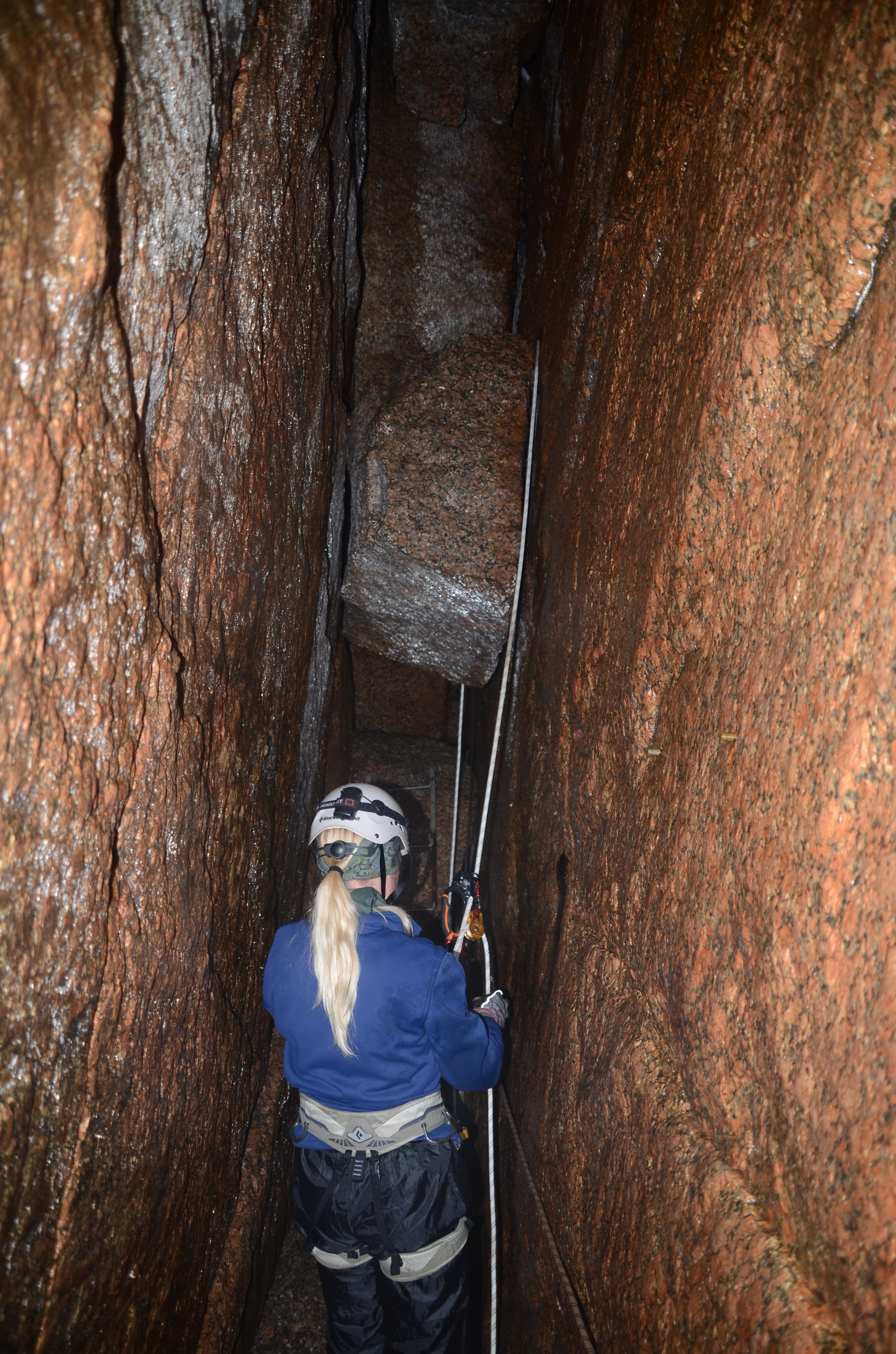 Ingångsskrevan är 70 meter lång, 24 meter djup och inte särskilt bred. Här är Annika på väg ner.