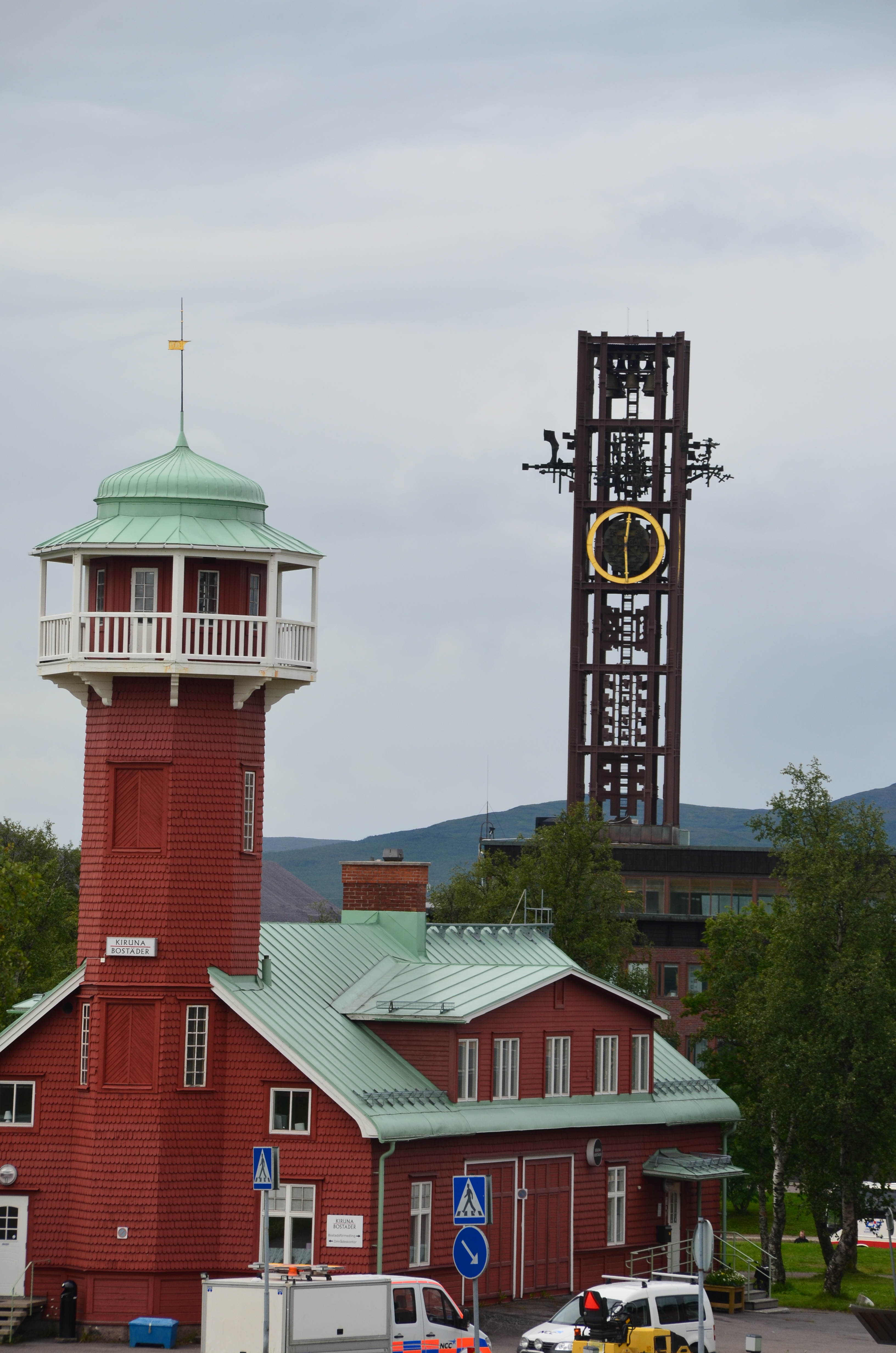 I Kiruna stannade vi över dagen och plockade lite cacher. Spännande att uppleva den här staden innan delar av stadskärnan ska rivas/flyttas p.g.a gruvdriften. Bland annat de här byggnaderna ska bort. I förgrunden den gamla brandstationen och bakom det kända stadshuset med klocktornet av järn.