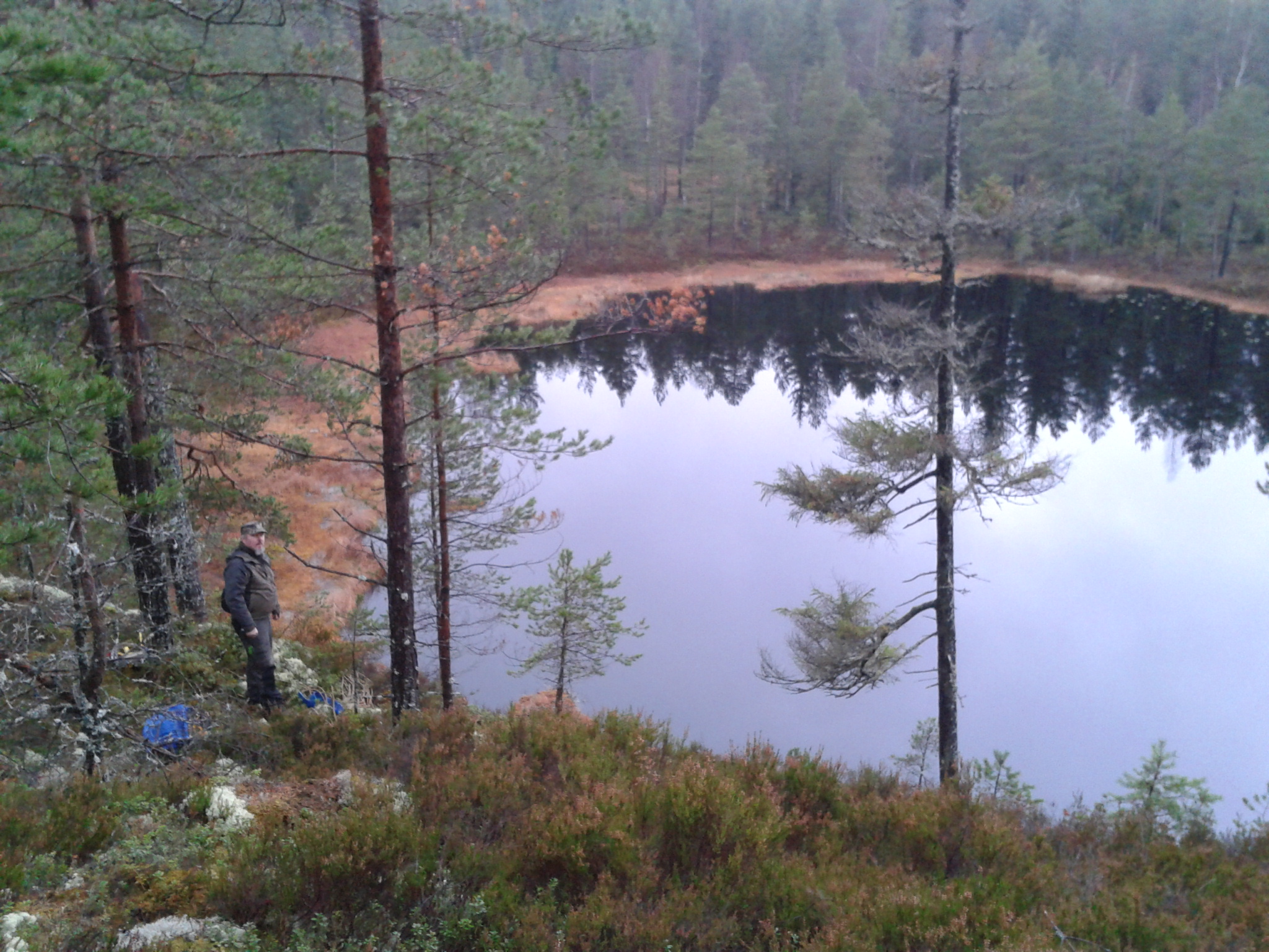 Vi hittade det vi skulle och kunde snart finna finalburken. Efter regnet kom det faktiskt lite blå himmel som speglade sig i den lilla tjärnen så här vackert. Vilka natursköna platser vi kommer till i den här underbara ”sporten”! 🙂