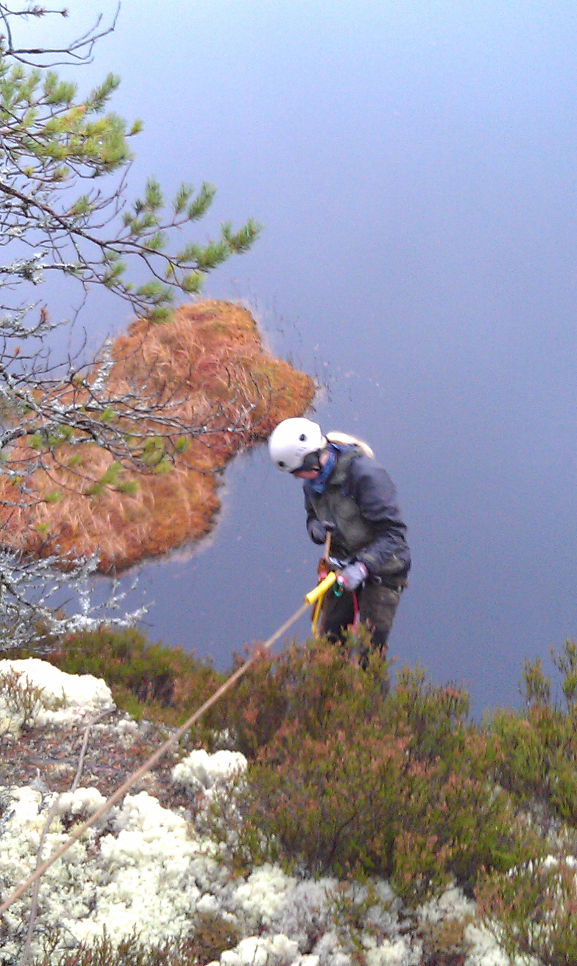 Här fick man fira sig ner i två steg. Här håller Hasse på och rekar var vi skall ankra klätterrepet.