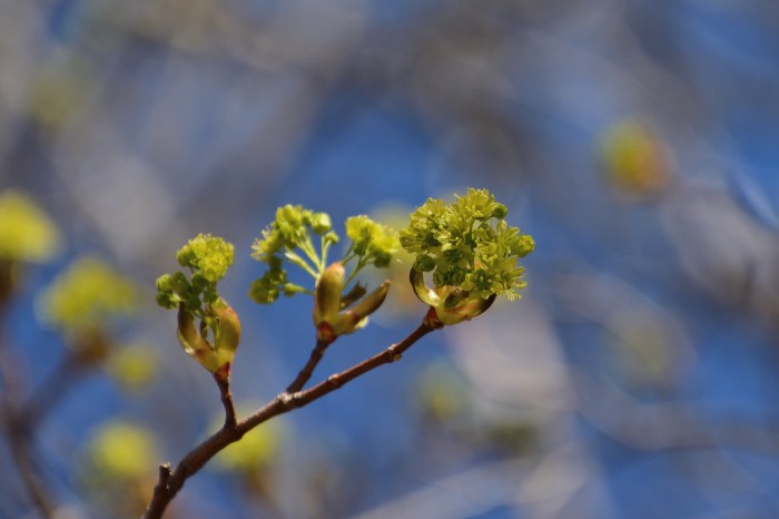 Lönnen blommar också nu. Jag har inte tänkt på förut hur fina dessa ljusgröna blommor är och inte heller lagt märke till att de blommar på bar kvist.