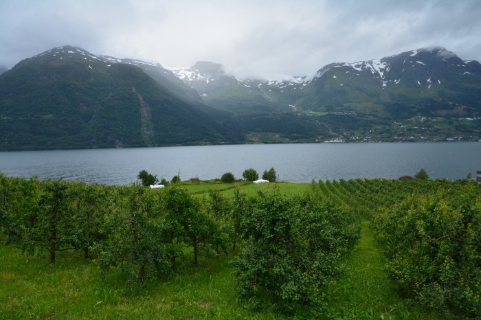 Trakten kring Odda och Hardangerfjorden är känd för sina fruktodlingar. Man menar att brittiska munkar odlade frukt här redan på 1300-talet och idag kommer 40% av Norsk frukt från det här området. Det är äpplen, päron, plommon och biggaråer man odlar. Tydligen är förutsättningarna och klimatet här vid fjorden väldigt goda för just fruktodling. Vi åkte mil efter mil där fruktträden stod i rader både ner mot fjorden.