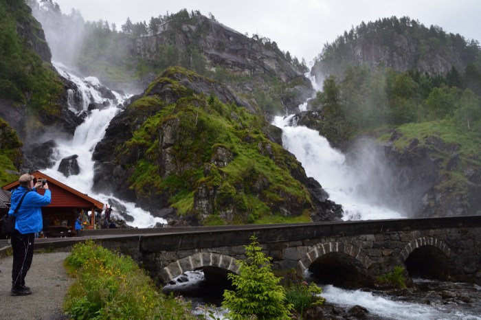 Det positiva med regnen och gråvädret var att det blev full fart i forsar och vattenfall. Här i bilden nedan beundrar vi Låtefoss.