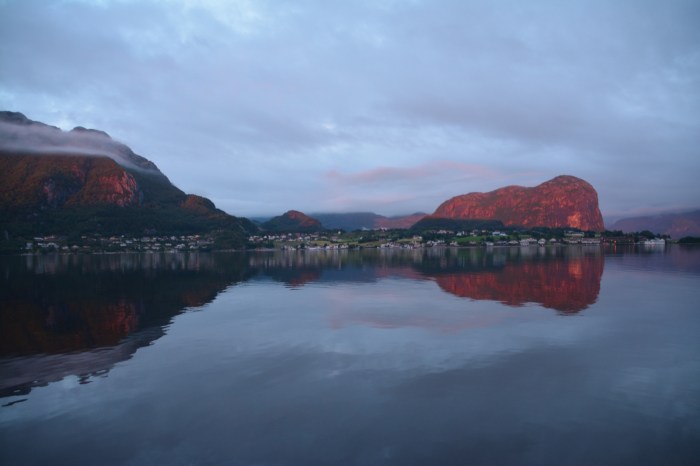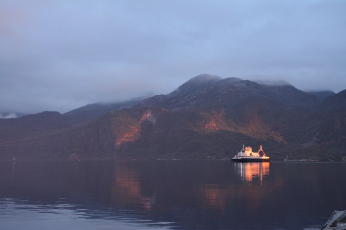 I Oanes, som ligger där Lysefjorden börjar, stannade vi för att övernatta. Det hade varit gråväder hela dagen, men framåt kvällningen upplevde vi ett magiskt solnedgångs-ljus som först lyste upp färjan.