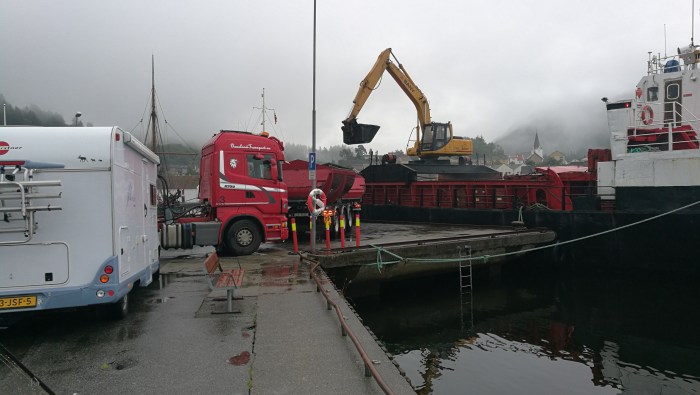 Vi var ett tiotal husbilar som stod här i godan ro och tidigt på morgonen väcktes vi av muller, slammer och höga röster som pratade på ett främmande språk. Det visade sig vara ett lastfartyg fyllt med ångande het asfalt. Asfalten skulle lastas på lastbilar och transporteras upp till de risiga vägarna uppåt fjällen. Vi fick snabbt flytta på husbilarna. Vi satt och drack morgonkaffet och tittade på när de lastade lastbil efter lastbil. Det var spännande men vilket uppvaknande. 😀