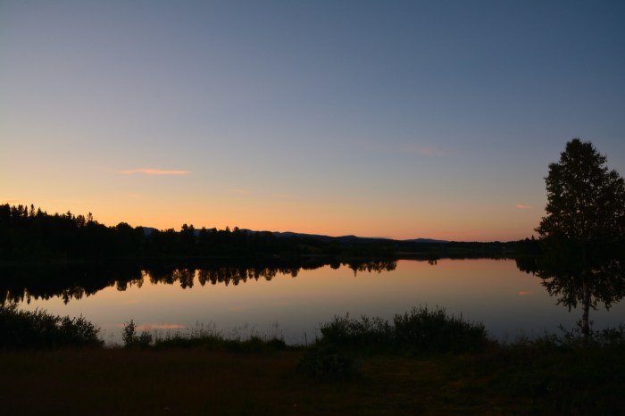 Kvällarna var riktigt stämningsfulla. Vi hade ett geocaching-event, Grillkväll på Putten, där vi fick besök av en ung man från Nederländerna samt två glada damer från Stockholm. 😀 Det blev en trevlig kväll och bilden här nedan är tagen alldeles efter eventet. Man ser fjällkedjan i horisonten.