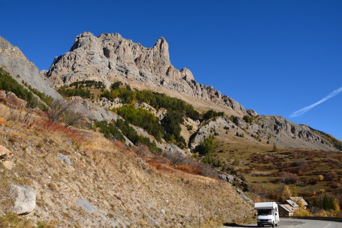 Vi åkte vidare och det visade sig att den ordinarie vägen vid sjön Lac du chambon var avstängd. Som tur var kom vi ändå vidare då vår husbil klarade både viktgränsen på 3,5 ton och längdgränsen på 8 m som de hade satt på den lilla reservvägen (Vår husbil är 5,90 lång och väger 3 ton). Skönt att ha en liten husbil, annars hade vi fått vända och åka tillbaka. I bildspelet nedan ser du vyer från den vägen. Visst ser det lite märkligt ut med det grå berget och de klara höstfärgerna. I ett par av bilderna ser man också vägen som vi skulle ha åkt på den andra sidan om sjön.