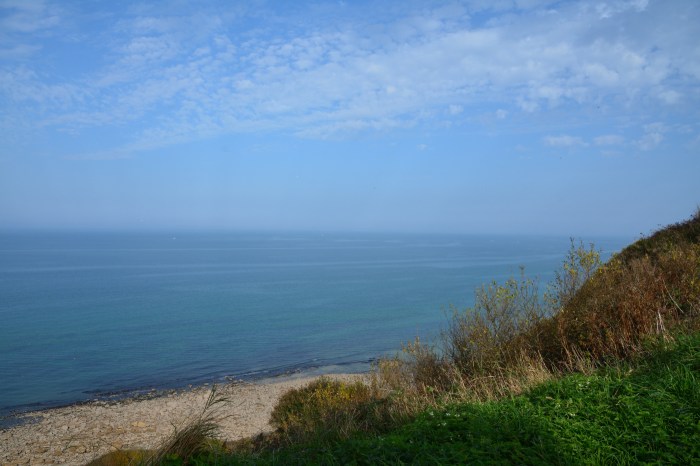 Efter vårt besök vid Omaha Beach så åkte vi en mil österut till Gold Beach. Här finns en fin ställplats där vi kunde övernatta i husbilen högt över havet med härlig utsikt.