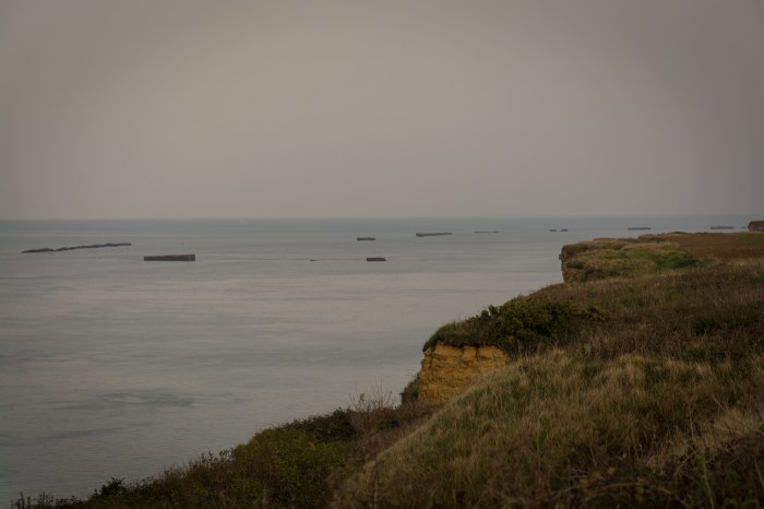 Lite mer statistik från Dagen D finner du via den här länken: www.history.com. Hela kusten här i Normandie bär spår efter andra världskriget, både på land och ute till havs. I bilden nedan syns märkliga betongblock i vattnet.