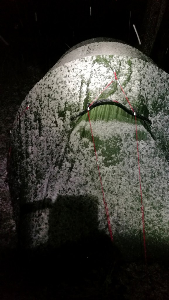 Snö på tältet