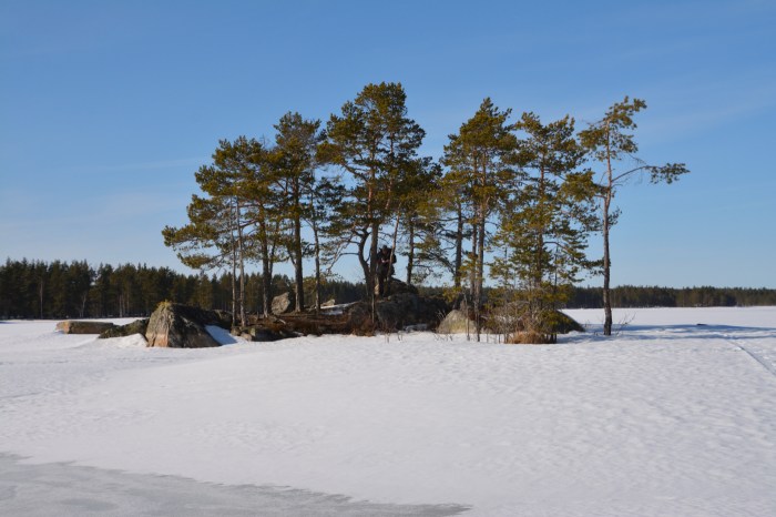 Det var härligt att kryssa mellan öarna. Ibland kunde vi följa skoterspåren, men mest gick vi uppe på den fina skaren. Här ser du en av de fina små öarna vi kom till.
