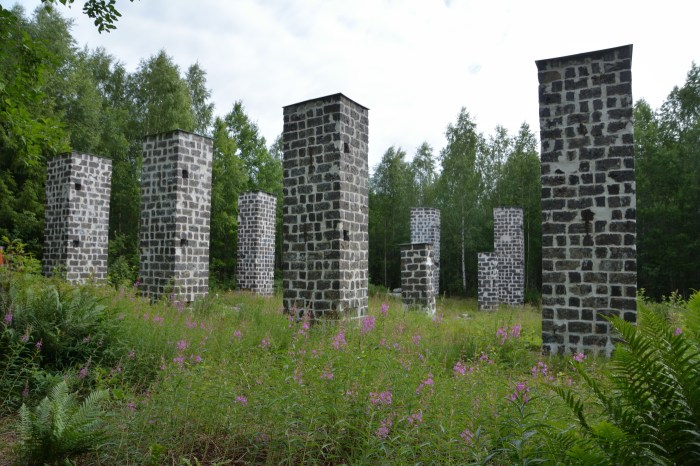 Här i Trummelsberg finns också dessa märkliga pelare som du ser i bilden här nedan. Det är lämningar från Trummelsbergs bruk som grundades av Olav Trummel (därav namnet Trummelsberg) år 1622 och lades ner 1907.