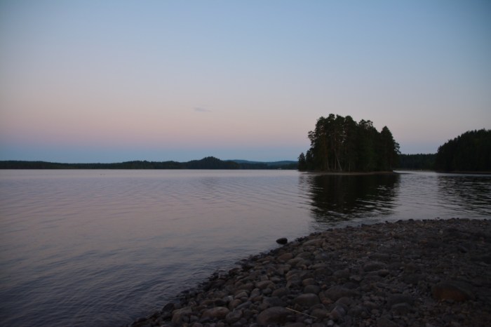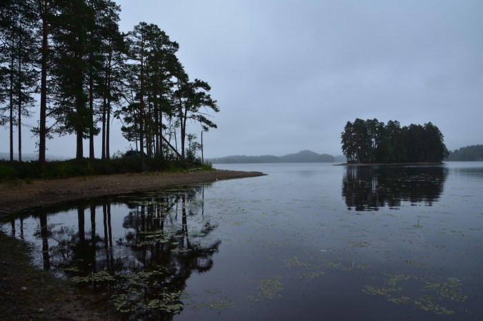 Om du tittar noga så upptäcker du tältet på udden i bilden här ovanför. Det var riktigt lågt vatten i Malingsbosjön. En del av näckrosorna hade blomman en bit uppe i luften och vi såg näckrosblad på torra land, vilket du kan se i galleriet här nedanför. I strandkanten växte också en fin lila blomma som jag inte vet namnet på. Någon slags trift kanske? (blåmunk har jag fått veta i efterhand – tack bloggarbjorn)