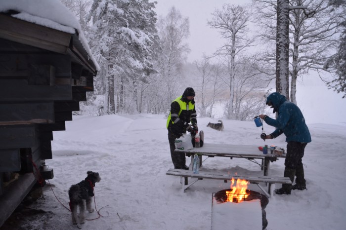 Ungefär hälften av oss stannade kvar för att vintercampa. Vi var sju stycken tappra själar som inte bangade för lite snö och kyla. Eller tio om man räknar med de tre fina hundarna som också var med. Det blev inte så många bilder tagna på kvällen i mörkret och snöyran, men vi hade det trevligt, trots det myckna snöandet. Vi skrattade lite när träden kastade ner snöbollar i nacken på oss när vi stod runt brasan. 😀 Till slut var det dags att krypa ner i våra sovsäckar.