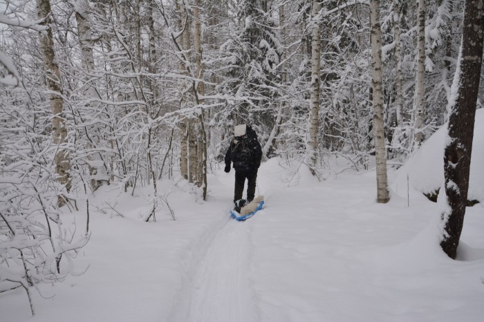 Stigen tillbaka gick genom en snöig skog. Hasse drog pulkan som vi haft med oss veden i. Nu var den lättdragen innehållande endast fårskinnet och tältet.