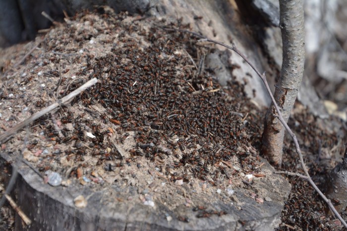 Myrorna har också vaknat till liv och myllrar i solen. Här hade de byggt stacken kring och i en stubbe.