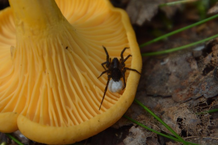 Under en av kantarellerna satt det en liten vargspindel-hona. Hon hade en liten äggkokong med sina blivande små spindelbarn. -Förlåt för att jag störde lilla spindelmamma. ❤
