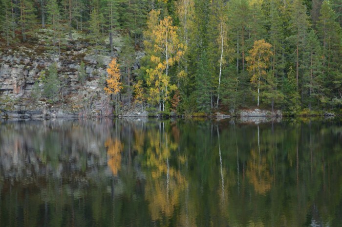 Då jag kom tillbaka ner från berget så hade dimman lättat och man kunde se de fina höstfärgerna spegla sig i sjön.