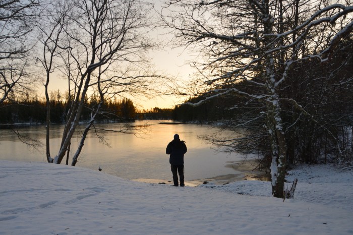 Tyvärr så drev molnen in och gömde solen då den väl hade gått upp. Vi dröjde oss ändå kvar ett tag och njöt av den friska luften. Termometern vi brukar ha med oss visade att det som kallast hade varit -9° under natten. Nu på morgonen var det runt -8°.