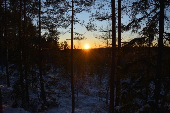 Man känner sig så nöjd när man klarat av sådana här utmaningar. Det är underbart att sova ute på vintern, men mycket mer att tänka på när det gäller säkerhet, utrustning och att hålla värmen. Efter att ha plockat ihop vår utrustning och släckt brasan så lämnade vi vackra Trummelsberg för denna gång. Får se när vi kommer hit igen. Sista bilden får bli ännu en soluppgångsbild med den magiska morgonhimlen.
