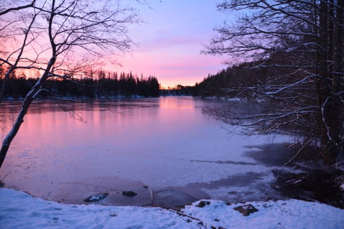 Igår tog vi oss till Trummelsberg för att ha vår 25:e utenatt på raken i utmaningen #Minst-en-utenatt-i-månaden som vi deltar i. Denna utmaning ger oss en sporre att komma ut och övernatta i naturen året runt. Vi gav oss iväg redan efter lunch för att få lite dagsljus, för solen går ju ner så tidigt den här tiden på året. Det var en vacker men kall eftermiddag och vi började med att gå ner till sjön Stora Kedjen och njuta av den här vackra platsen.