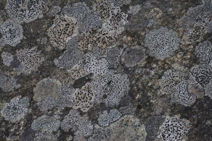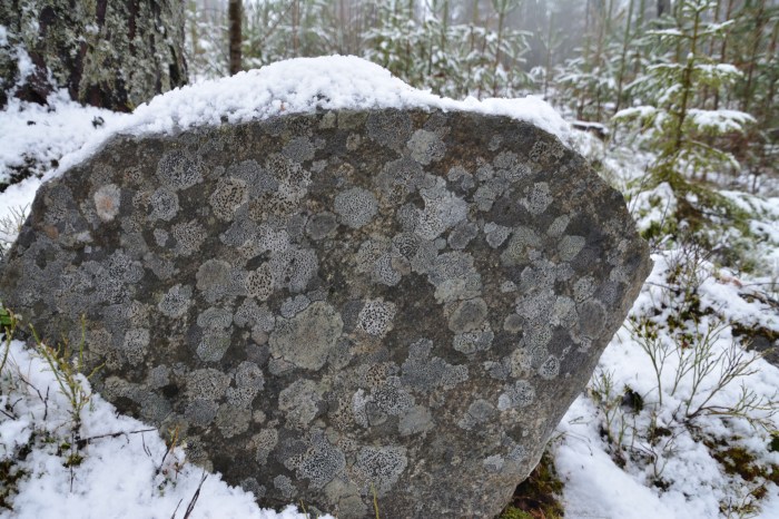 Vid Ötjärnsmossen lämnade vi Ötjärnen och vek av åt vänster. Här såg vi en sten med grå kartlav. Visst var den fin!