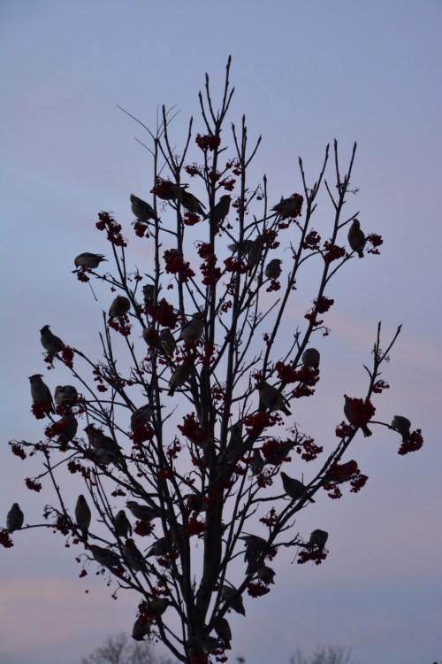 Det har blivit lite turer så här i mellandagarna. Igår morse sken solen så fint så jag bestämde mig för en tur till andra sidan här i Fagersta. På vägen dit så såg jag en massa sidensvansar som satt och åt rönnbär i en rönn. Det såg så härligt ut när den lilla rönnen var helt full av fåglar. Solen hade inte kommit upp så högt än, så sidensvansarna blev som silhuetter på bilden.