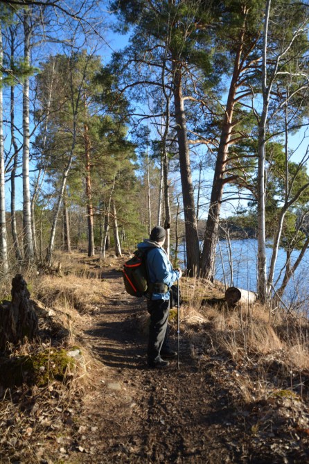 Vi bestämde oss för att göra en längre tur längs vattnet i Fagersta. Vi tog bussen till Sundbo-infarten och därifrån gick vi hem via Skeppmoraviken, Uggelbo, Västanfors och Linjan/Andra sidan. Det var en strålande Januari-dag och solen värmde. Inne i viken låg en tunn is, annars var det fortfarande öppet vatten i sjön Stora Aspen.