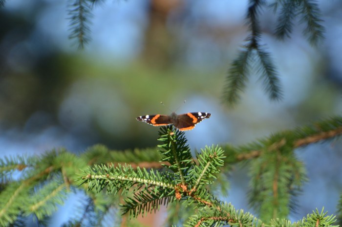 Uppe i en gran på en gren satt en Amiralfjäril. Lite svårfotad, för den satt ganska högt uppe.