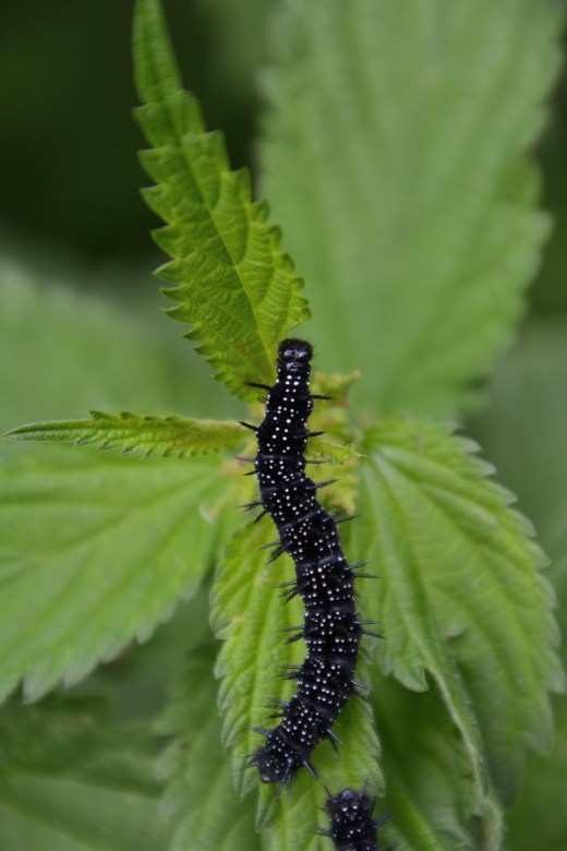 Jag såg två olika stadier av larver från fjärilsarten Påfågelöga. De yngre satt i klungor och knutar.