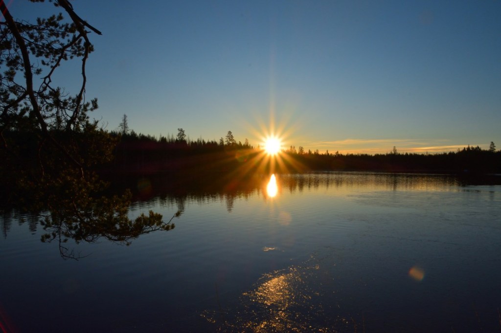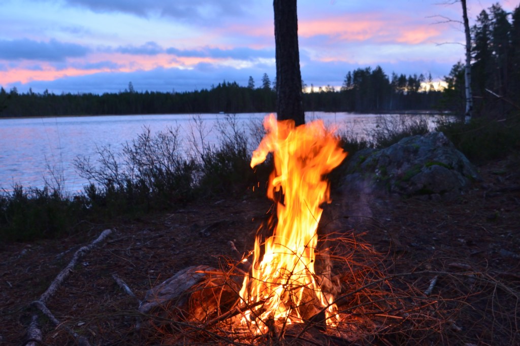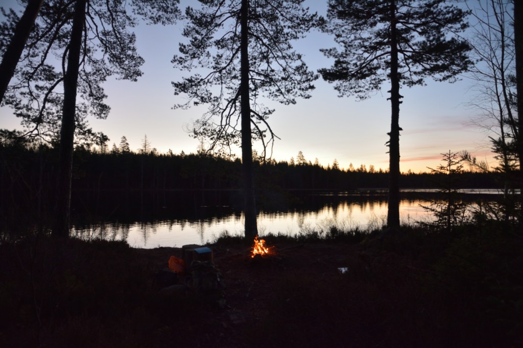 Jag värmde upp kroppen genom att gå ut och leta efter torra pinnar och ved. Snart var brasan igång igen och jag ställde mig för att vänta på solens första strålar. När de nådde över skogskanten så kändes det underbart efter en ensam natt i skogen. 🙂