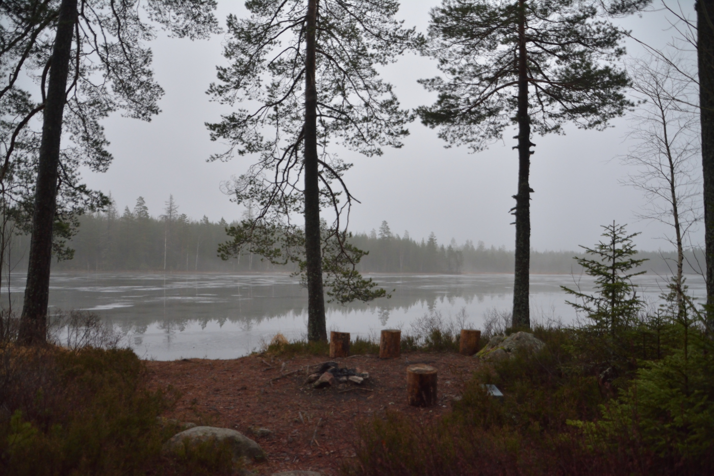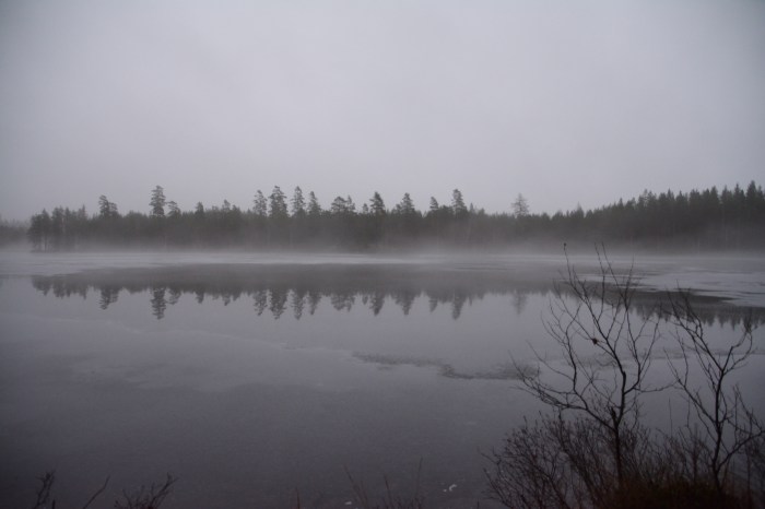 Vid sjön Ötjärn har dimman legat och gjort allt lite mystiskt och nästan svart-vitt. Isen ligger på hela sjön, men den är inte hållbar efter allt töväder.