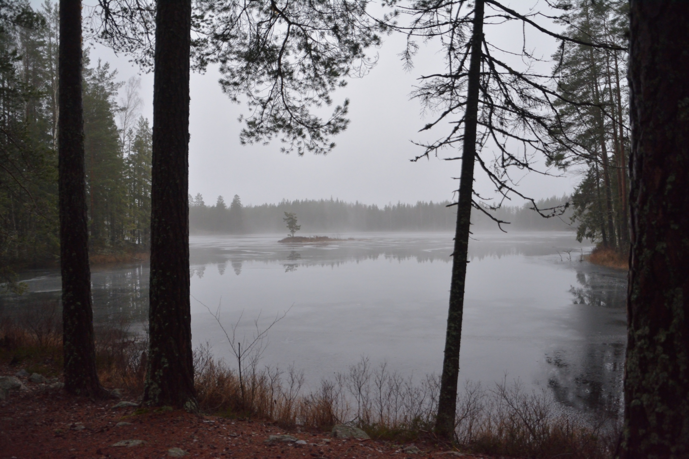 Skogen är underbar i (nästan) alla slags väder, bara man är klädd så att man klarar fuktigheten och regnstänken som kan komma. Det är så värt att trotsa gråvädret och ge sig ut på tur. Sista bilden blir ännu en dimbild från Ötjärn. Se bara på den härliga dimman och vattnet som ligger uppepå isen. Magi i naturen.