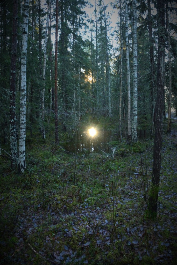 När vi gick en skogstur i Kottmosseskogen så speglade sig solen i en vattensamling. Det blev en ganska rolig bild. Det ser ut som att det ligger något och lyser i mossan.