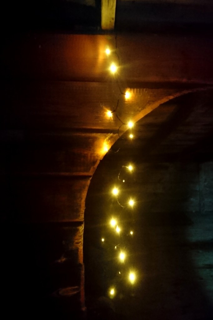 Regnet som varit på dagen hade nu övergått i snöfall. När Hasse återvände hem så gjorde jag det lite hemtrevligt i vindskyddet med en liten batteridriven ljusslinga som jag tagit med mig. Jag lade också lite granris på den leriga marken. Nu var jag redo för decembers övernattning.