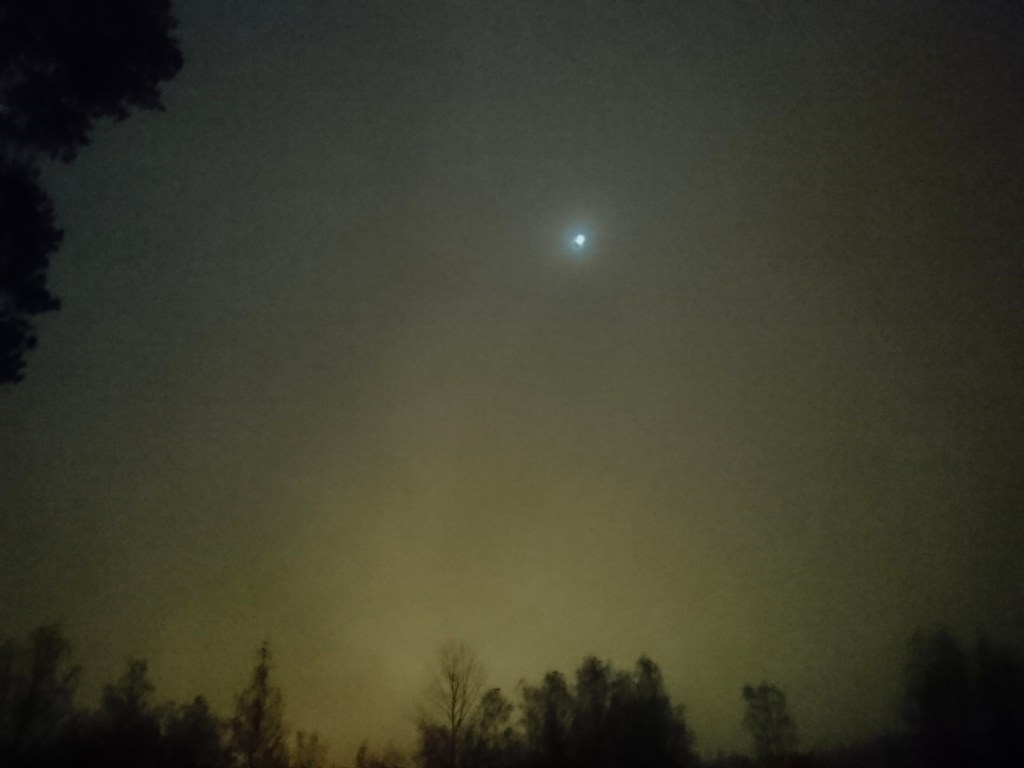 Det var så stämningsfullt och fint med den knastrande brasan och snön som föll. Snön gjorde att allting blev ljusare och man såg långt ut i landskapet. Vid 21-tiden på kvällen kom fullmånen fram och syntes lite suddigt bakom molnen. Tyvärr blev månen inte så stor i mobilens kamera, men man kan ändå ana den magiska stämningen i bilden här nedanför.