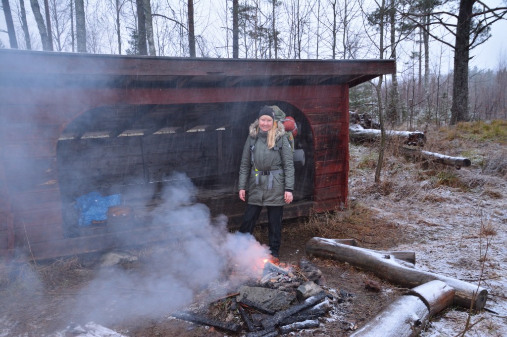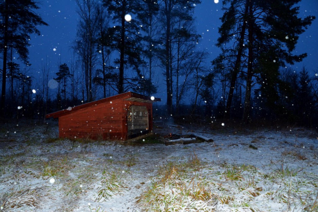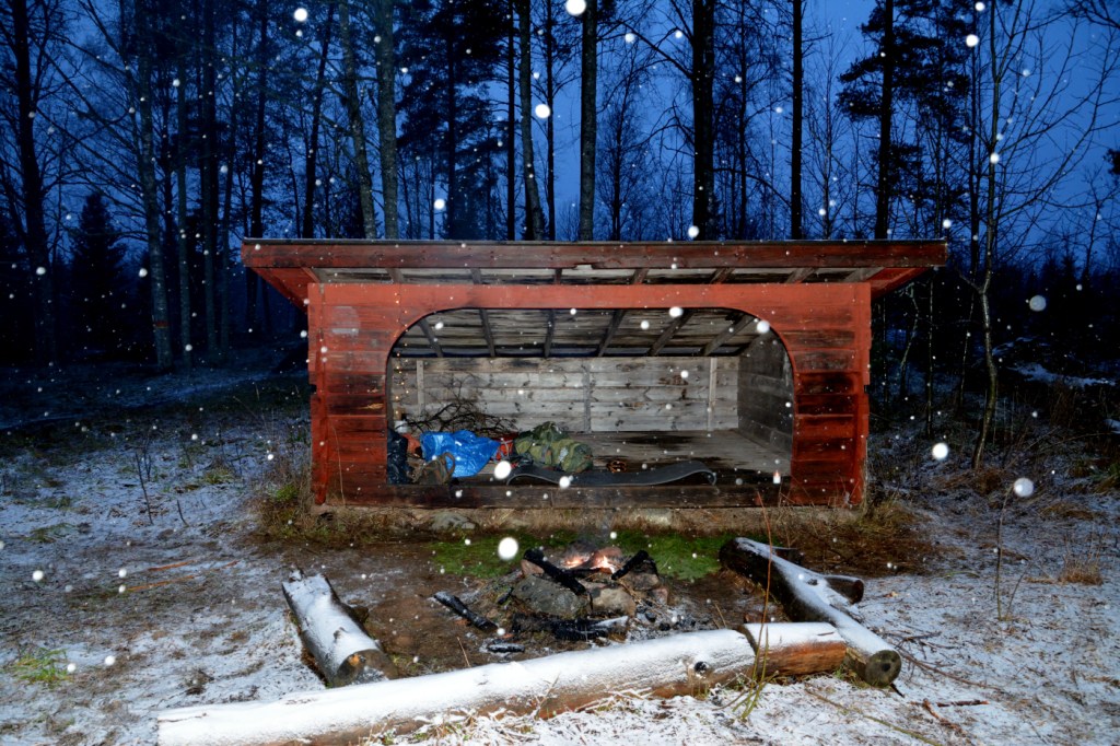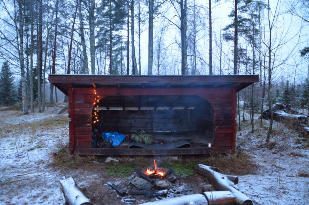 Igår tog jag mig ut till Flobostigens vindskydd för att övernatta ute i naturen den sista gången för i år. Hasse hjälpte mig att bära dit lite ved, för nu är det inte lätt att hitta något som är torrt ute i skogen. Vi hade sån tur, att när vi kom till platsen så var det redan en fin glödbädd i eldstaden, men inga människor syntes till. 🙂